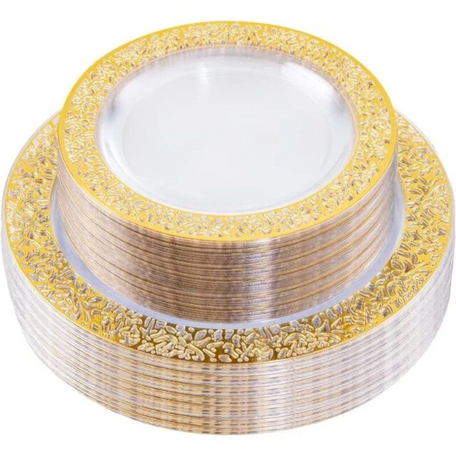 With our clear plastic plates featuring gold trim, you’re not just investing in dinnerware; you’re investing in creating unforgettable moments. Indulge in the luxury of effortless entertaining, and let our gold plastic plates be the highlight of your next gathering.