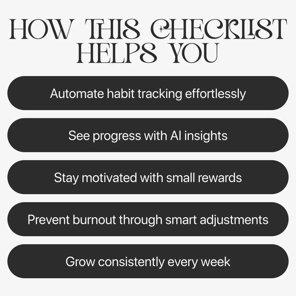 This checklist is perfect for anyone ready to make lasting personal improvements with less effort and more focus. If you love organization, data-driven growth, and want habits that actually stick, this is for you.