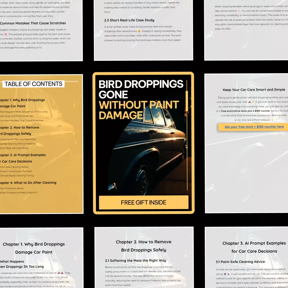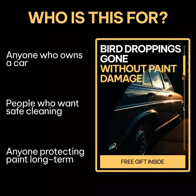 Bird Droppings Gone Without Paint Damage is a clear, step-by-step digital guide designed for car owners who want real answers—not guesswork. Bird droppings can quickly etch into your clear coat, leaving stains, dull spots, or permanent damage. This guide shows you exactly how to remove bird droppings from car paint using safe, proven methods that protect your vehicle’s finish. Whether the mess is fresh or dried on, you’ll learn what actually works and what to avoid.