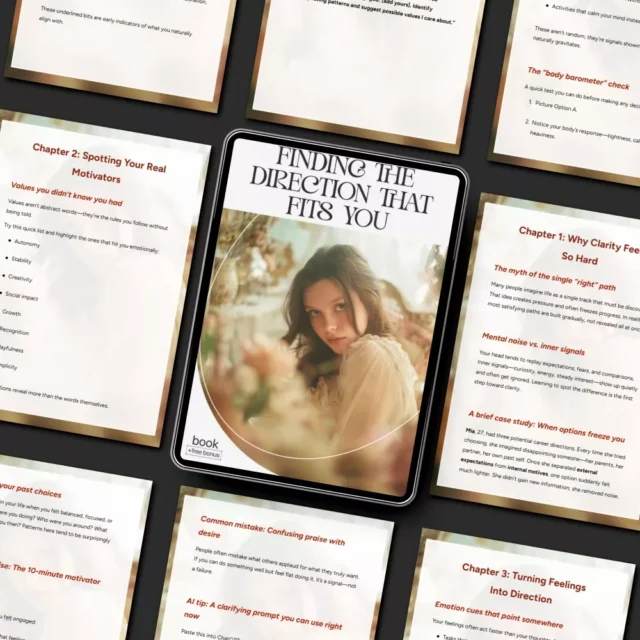Unlike generic self-help resources, Finding the Direction That Fits You doesn’t push one-size-fits-all answers. It blends psychology, structured reflection, real case studies, AI prompts, and practical experiments in a calm, non-judgmental way. It focuses on progress instead of perfection and gives you tools you can reuse whenever you feel lost again.