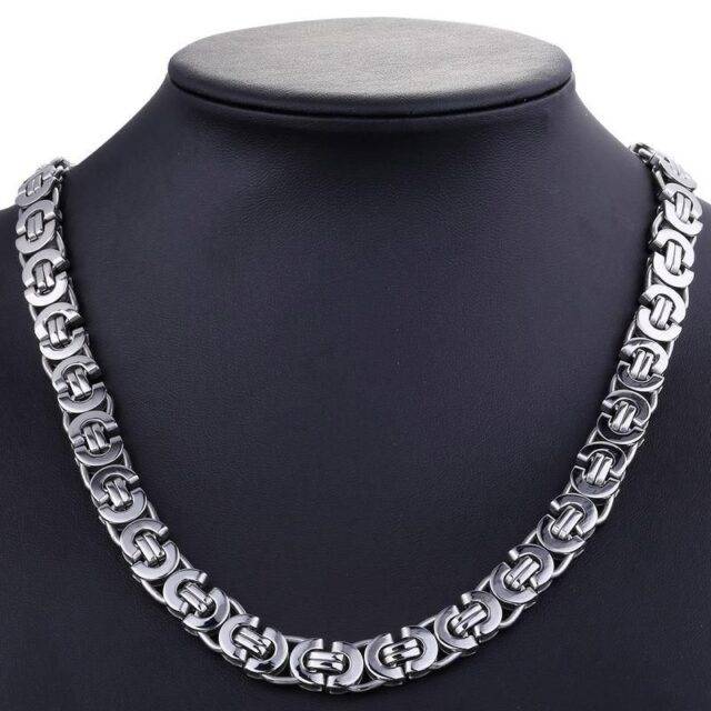 Each necklace is meticulously crafted from high-quality 316L stainless steel, known for its strength and resistance to tarnishing. The intricate Byzantine link design adds a unique geometric pattern that catches the eye, making it an ideal choice for those who appreciate fine details. With no pendant to distract, the focus remains on the sophisticated chain design.