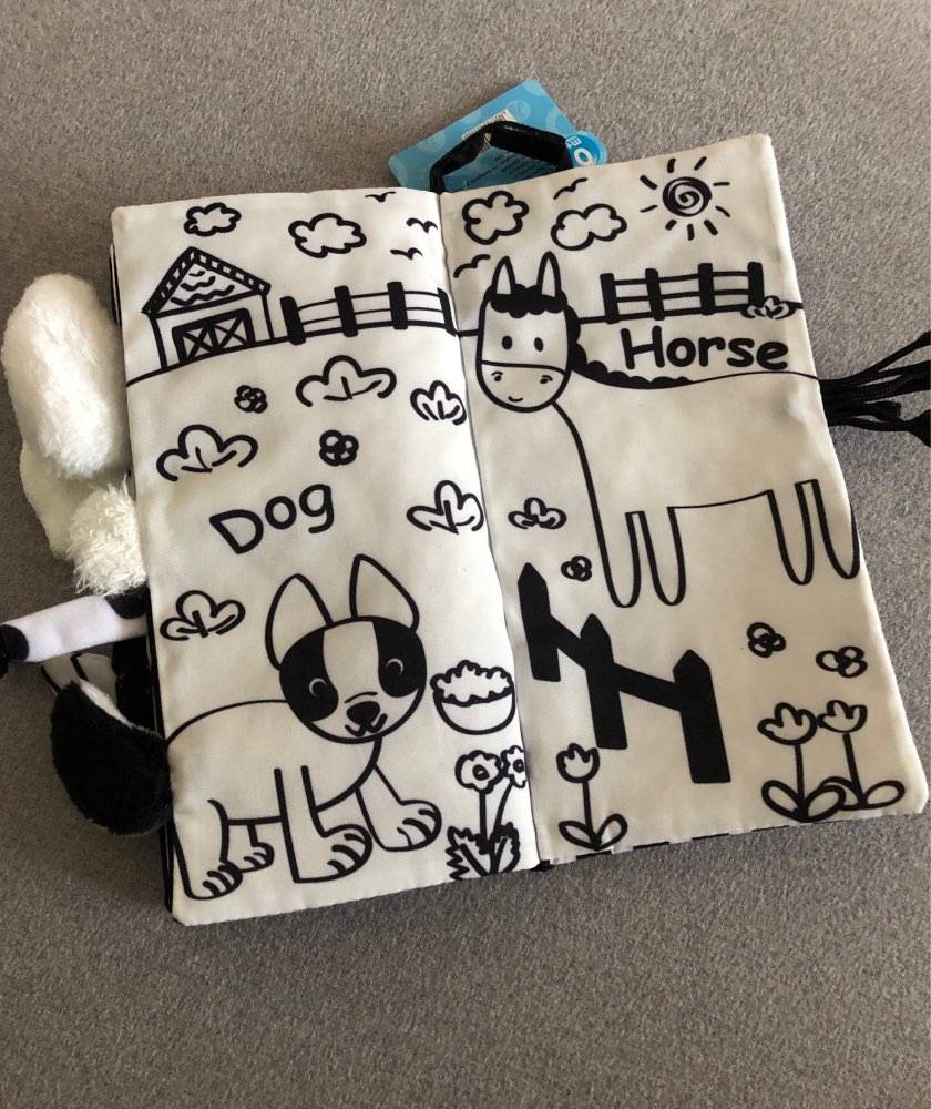 Let your baby physically feel and be attached to a fun story with this exquisite, unique storybook experience. Each page features recognizable animals with labels to allow your child to build his or her cognitive skills and animal recognition. The black-and-white nature of this storybook also aids in stimulating visual development.