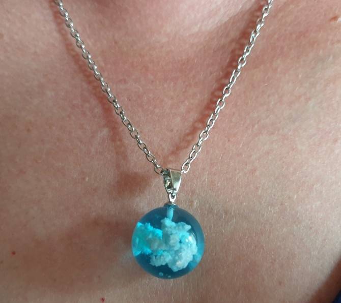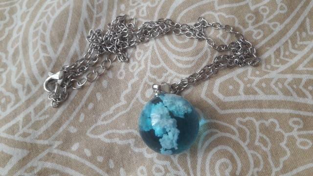 This necklace is ok, but in person the resin looks much more like plastic than glass. And the white parts are fine, but they don't look like clouds. It does seem like an item that would vary with each piece, though. Overall, this necklace is fine, but feels more like a toy than a piece of jewelry for an adult.