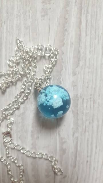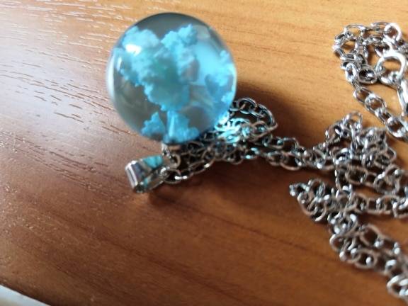 I wasnt sure what to expect, however, this Blue Sky Cloud Resin Necklace is a pretty piece of casual costume jewelry. It might not go with a cocktail dress but it looks cute with jeans. The resin globe is about 3/4 of an inch round. Reminds me of a gum ball. You can see the cloud formations are different through out the pendant and I am sure each one is unique and no two are the same. A few areas on mine the white cloud is seen on the edge, not the blue resin. The chain is about 18-20 inches in overall length. Its not fancy, just a casual piece of costume jewelry that is cute. Its priced less than $20. It comes in a nice manilla colored box to give as a gift.