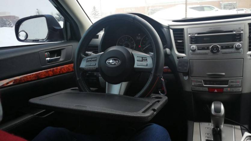 and the steering wheel doesn't have to be turned upside down. This makes the occasional eating in the car much neater. This table, I got the large one, is sturdy and does require a seat adjustment. The flip side has a nice writing surface and a place to secure a pen or pencil. Happy with my purchase. Suggest using this with the engine off if you intend to set your soda on the tray. The combination of power steering and the weight of a full drink on the tray can result in a wet lap. Lol, it hasn't happened yet but I'm just putting it out there