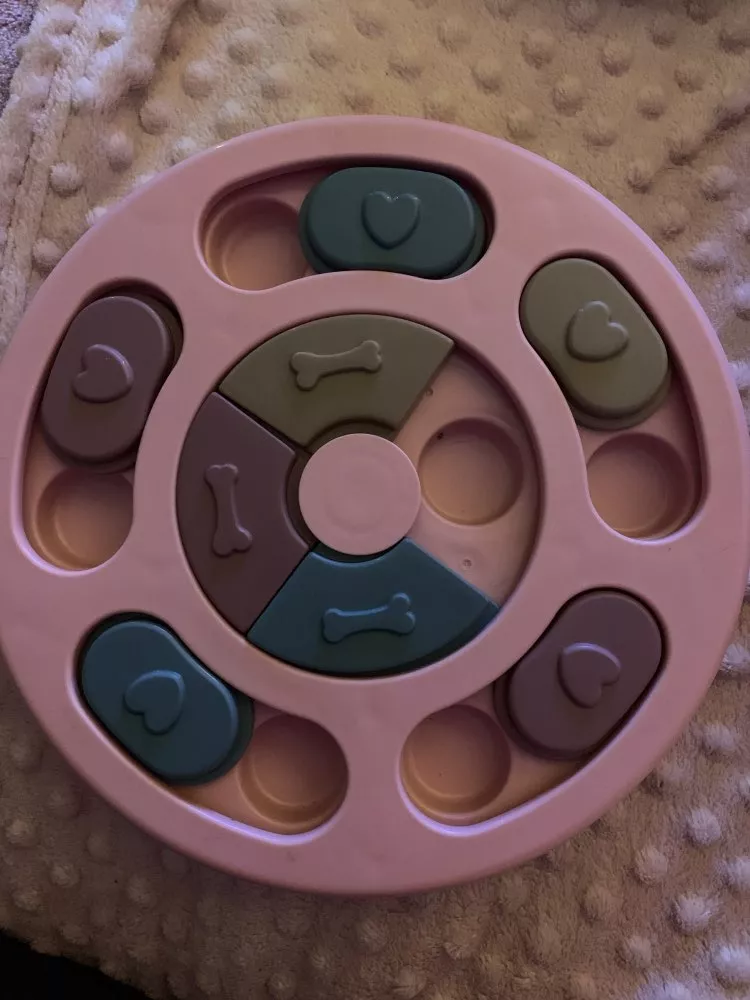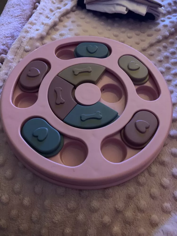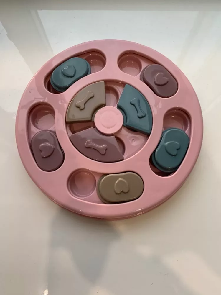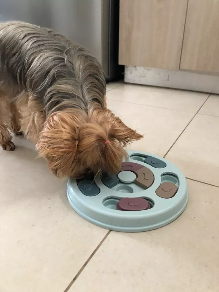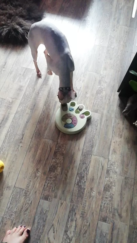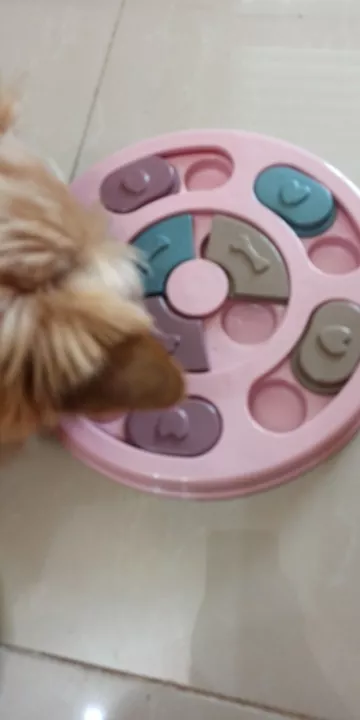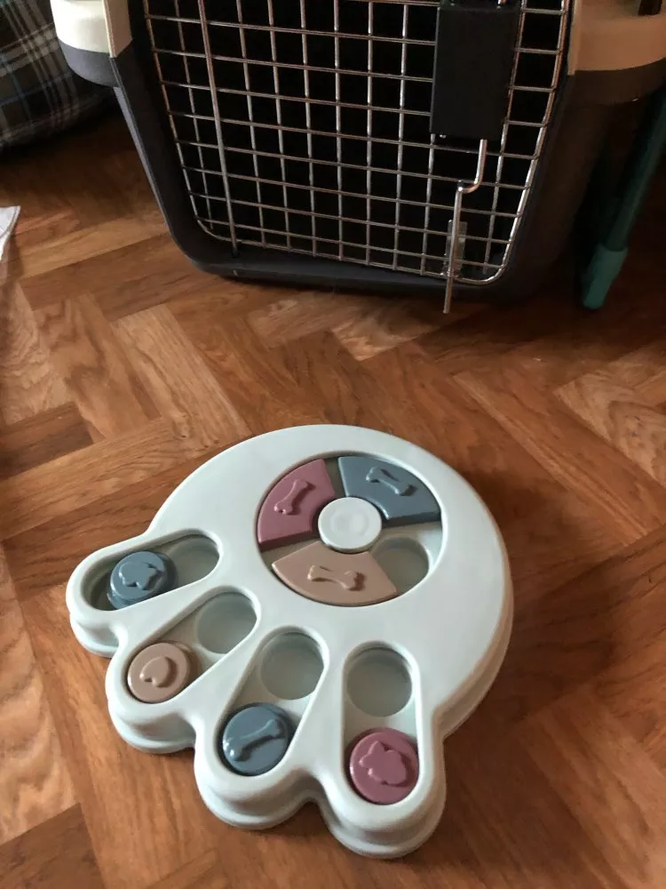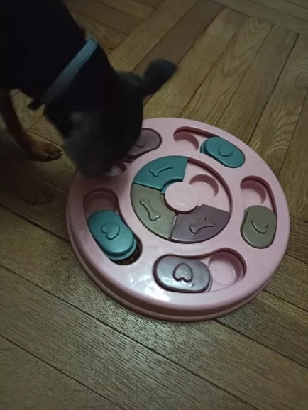 I wasn’t sure if my dog would have anything to do with this. I put treats in it and set it by my dog’s bed. I adopted him after he was rescued from a hoarding situation so he really hasn’t had toys to play with. I’ve had to teach him how to play with them. I noticed the freebie treats were gone one day and checked the rest of the puzzle. All gone! I was amazed. Filled it back up and left it for a few days. Empty again. Now I’ve watched him do it and it’s so funny. I’m going to try to get a video of it. He’s a 15lb chiweenie. Half chihuahua half dachshund and much smarter than I gave him credit. lol