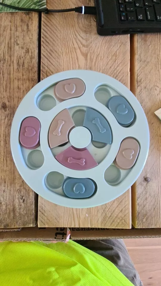 My Border Collie, Grace, just loves this "toy." Dogs like Grace need constant mental, physical, and emotional stimulation and this thing helps for a few minutes in the evening. She has learned to check index every one, looking for a treat. When she finds one, she not only gets a treat, but she gets our praise. She has learned to use both her nose and her paw to manipulate the rounds. It is well built and heavy enough that it stays in place when Grace is playing with it. Because she still chews everything, after a few games, we take it up off the floor. Wonderful toy and I'm highly recommending.