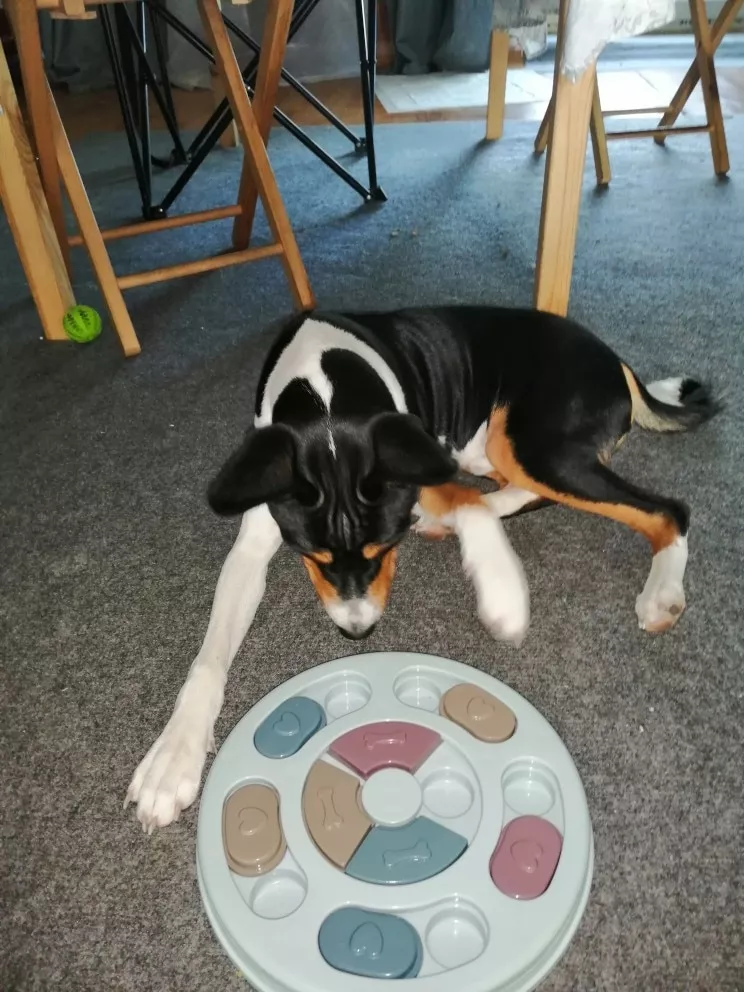 I love my dog more than life itself. He’s a rescue so not sure of his age. We think 15 (going on 3). Bought this puzzle hoping he would have fun and use it. Had no clue how fast he took to it. He’s not the most ‘intelligent’ so I wondered but he got the treats so fast. He hasn’t used his paws yet to move the pieces around, just uses his nose, but he’s doing it. Everytime he gets one I cheer for him and his tail wags like crazy and he continues on. He love his puzzle. I can’t wait to get him more so that he will get that brain going when I’m at work during the day (even though he’d probably play with it before I am even out of the driveway)