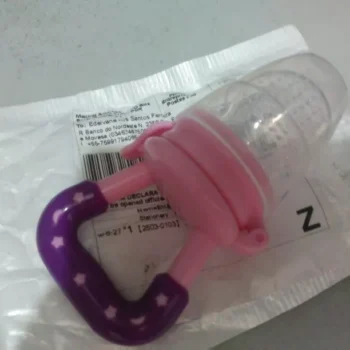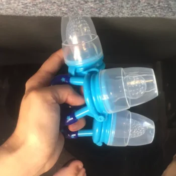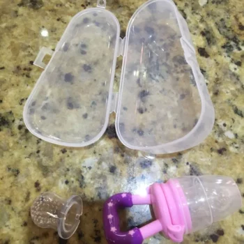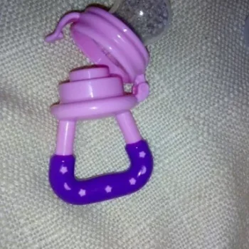Got this for my 5 month old who just started trying food and has been teething since 3 months with no progress. I used the smallest one with frozen blueberries and she loved it. She can hold it herself with little help and I love that it can be cleaned very easily. We had a mesh feeder and tossed it because it is so hard to clean really well and just gets floppy and gross when the food thaws. This is a much better alternative and great price. My only concern is that the nipple piece can be removed too easily but hasn’t caused any issues yet.