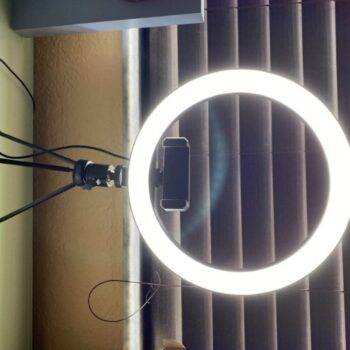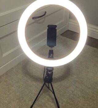 This is the perfect little light ring! My others are too big for counter top filming like for face washing videos. I mounted this one to the mirror in my spare bathroom using command strips. That way I can take it on and off as needed. It’s big enough for my phone to fit in the center and bright enough for what I need it to do! Great price!