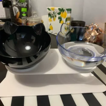 These bowls are super cute and look great. My cat like them because they are clear. They are easy to clean and feel sturdy as they are plastic.