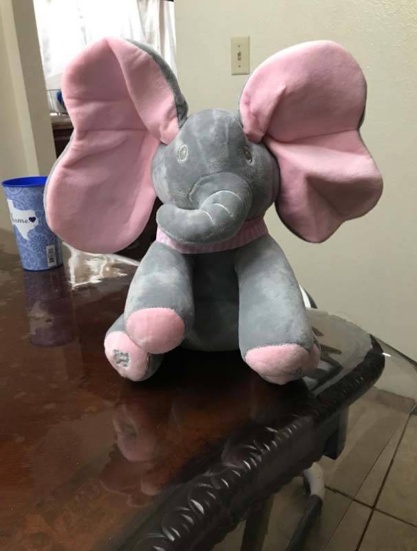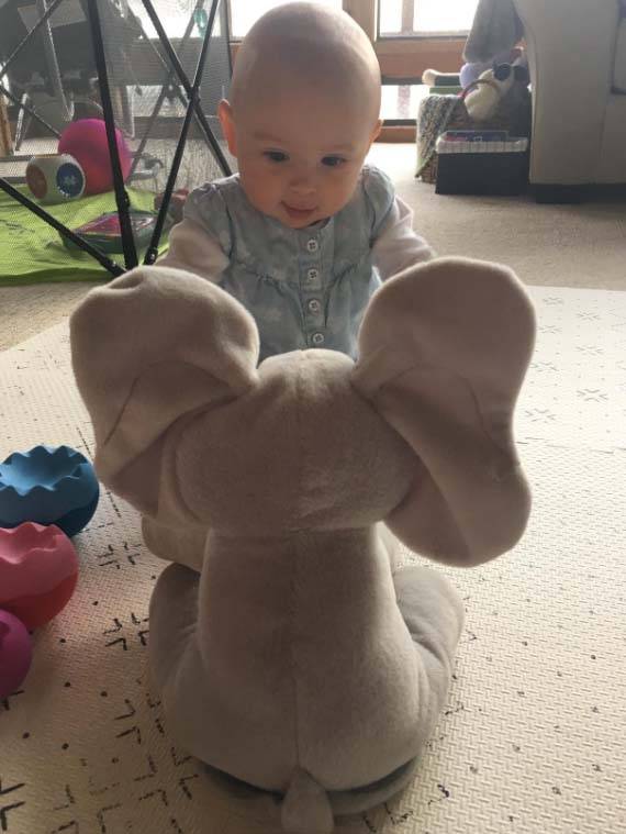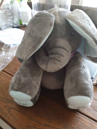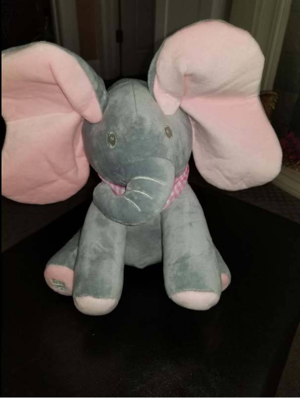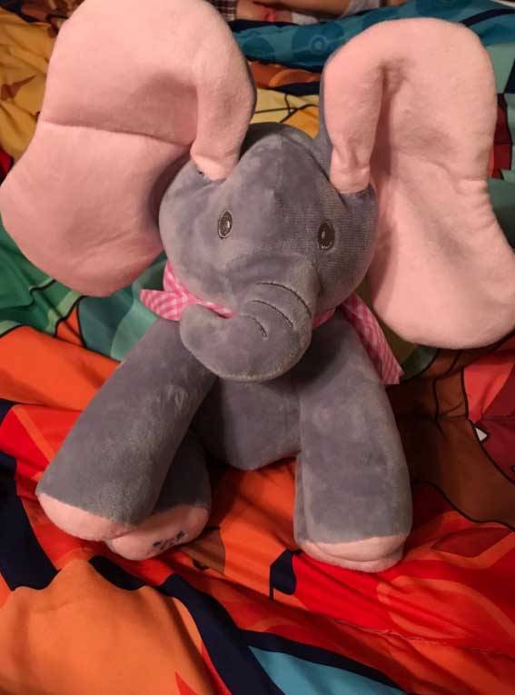 It was gifted to my almost 4-month-old son for Christmas this year. The voice of the elephant is very sweet and not annoying like some toys. It is a loud volume and piques the baby’s interest. The ears cover the eyes and pass for a second before opening up. I like that it has buttons on the feet for singing or playing. It is crazy soft. So soft I almost dropped it a couple of times lol.