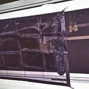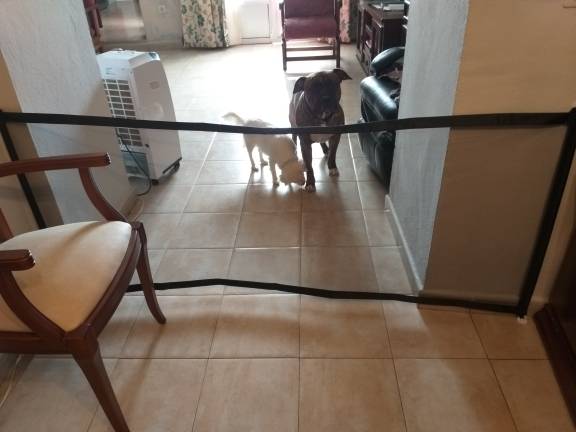It’s easy to store since it’s flexible and takes up way less space than a baby gate. It holds back my dogs and is very easy to install onto any door or pathway.