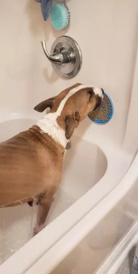 This was difficult to get to stay in place on the tile wall. It didn’t make Bath time any easier to have this falling off and smearing peanut butter on the pup when fell. It was a pain to clean. Probably cleans easily in a dishwasher. But hand washing required lots of soaking and scrubbing, multiple times. More trouble than it was worth.