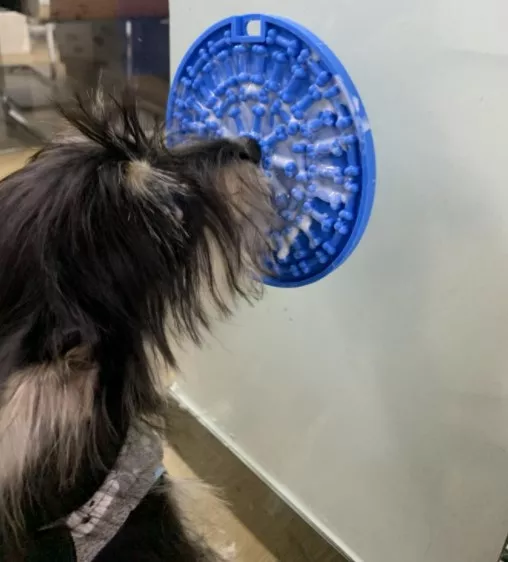 I used this to calm my hyper neurotic schnauzer during grooming. Poor little guy was abused by a groomer when he was young, and has been VERY difficult to groom ever since. I’ve long been on the lookout for anything that will help calm him. Can’t take him to a groomer anymore, because he gets so stressed out. Grooming can take hours because he is so nervous. This tool was amazing. I was able to use the electric trimmer to do his belly, back and hind quarters quickly with no drama! Going to try it with my other schnauzer during his bath. My advice is to use just a little peanut butter or wet dog food at a time. Very thin layer. That way the dog really has to work for it and doesn’t fill up and get bored. This is the best grooming aid ever! It’s a wonderful, wonderful thing!!!!!!!
