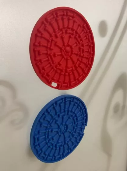 I just finished cutting and dremeling toenails on my three dogs with their total cooperation, thanks to this product. I just put squirt cheese in between the nubs of the slow treater, laid it on the grooming table, and the dogs were happily licking away while I worked on their feet. No pulling away, no second person to hold the dog, just me, some cheese, and the slow treater. I’m a fan!!!