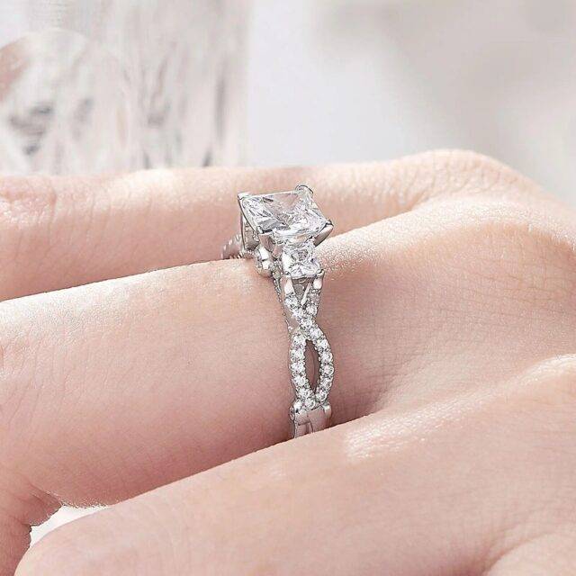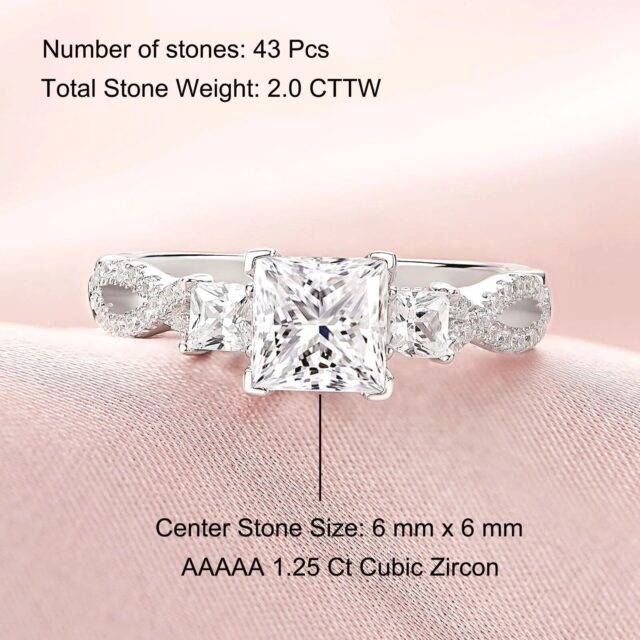 Our ring boasts a stunning princess cut cubic zirconia centerpiece, measuring 6x6mm and equivalent to 1.25ct. The sparkling AAAAA grade zirconia mimics the clarity and brilliance of a real diamond, set in high-quality, solid 925 sterling silver. The prong setting ensures security and enhances the stone’s radiance. With a total weight of 3.64g, this ring offers a substantial feel without compromising on comfort.
